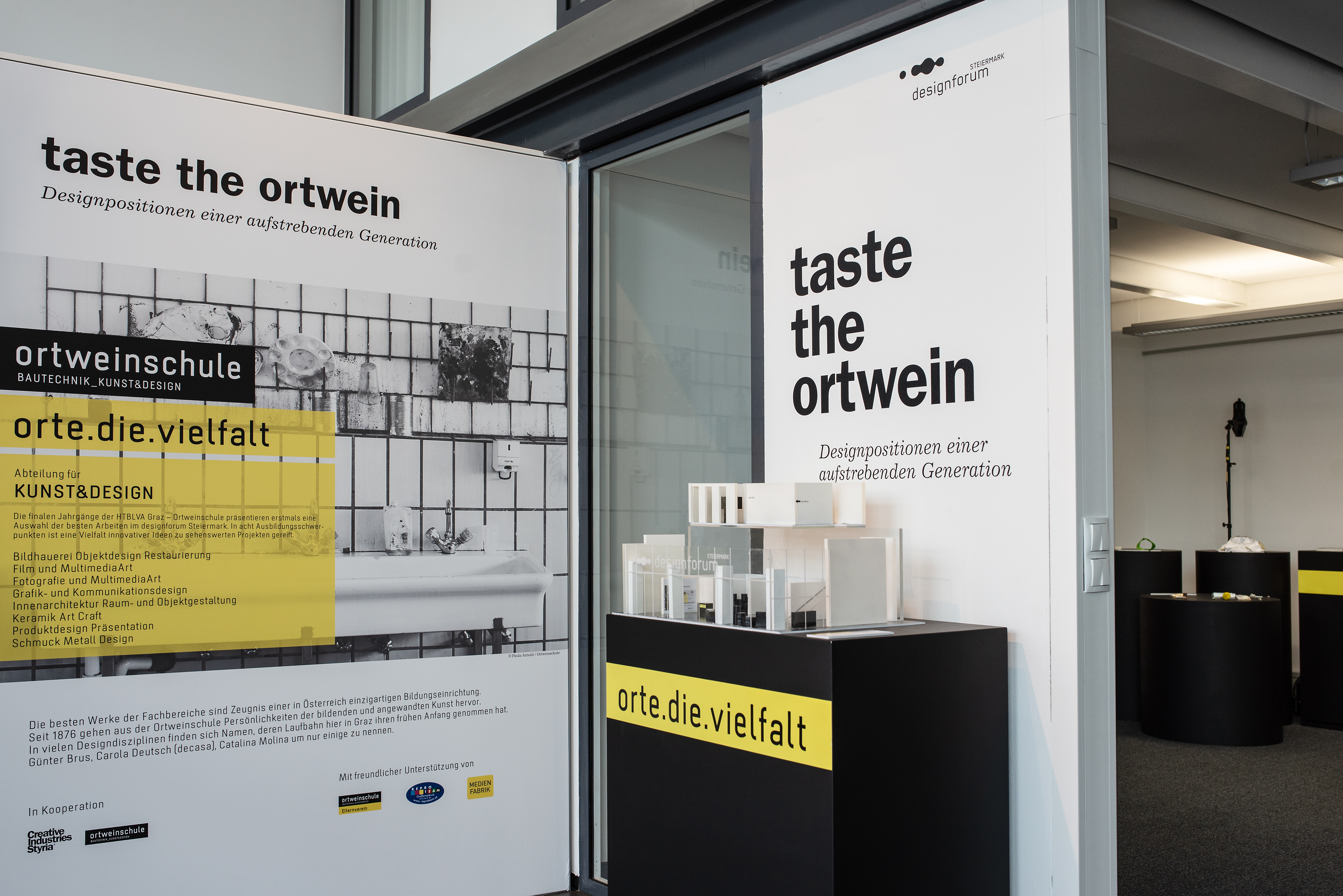 Zu sehen ist eine Zusammenstellung von Abschlussarbeiten der aktuellen AbsolventInnen einer in Österreich einzigartigen Bildungseinrichtung. Seit 1876 gehen aus der Ortweinschule Persönlichkeiten der bildenden und angewandten Kunst hervor. In vielen modernen Designdisziplinen finden sich erfolgreiche Kreativschaffende, deren Laufbahn hier in Graz ihren frühen Anfang genommen hat. Günter Brus, Carola Deutsch (decasa), Catalina Molina sind einige davon.